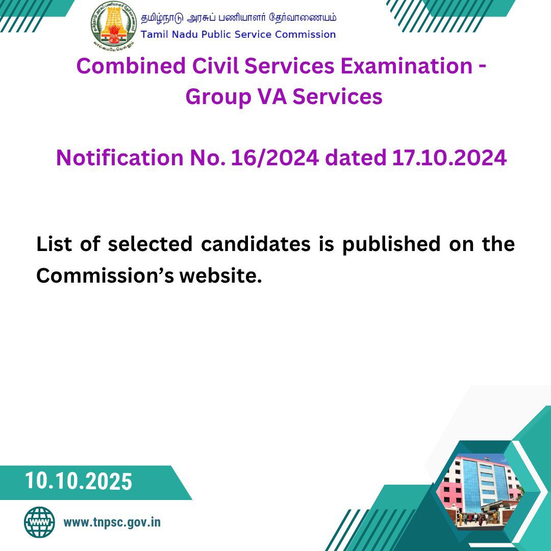 The Tamil Nadu Public Service Commission (TNPSC) has released the list of selected candidates for the Combined Civil Services Examination β Group VA Services (Notification No. 16/2024 dated 17.10.2024).