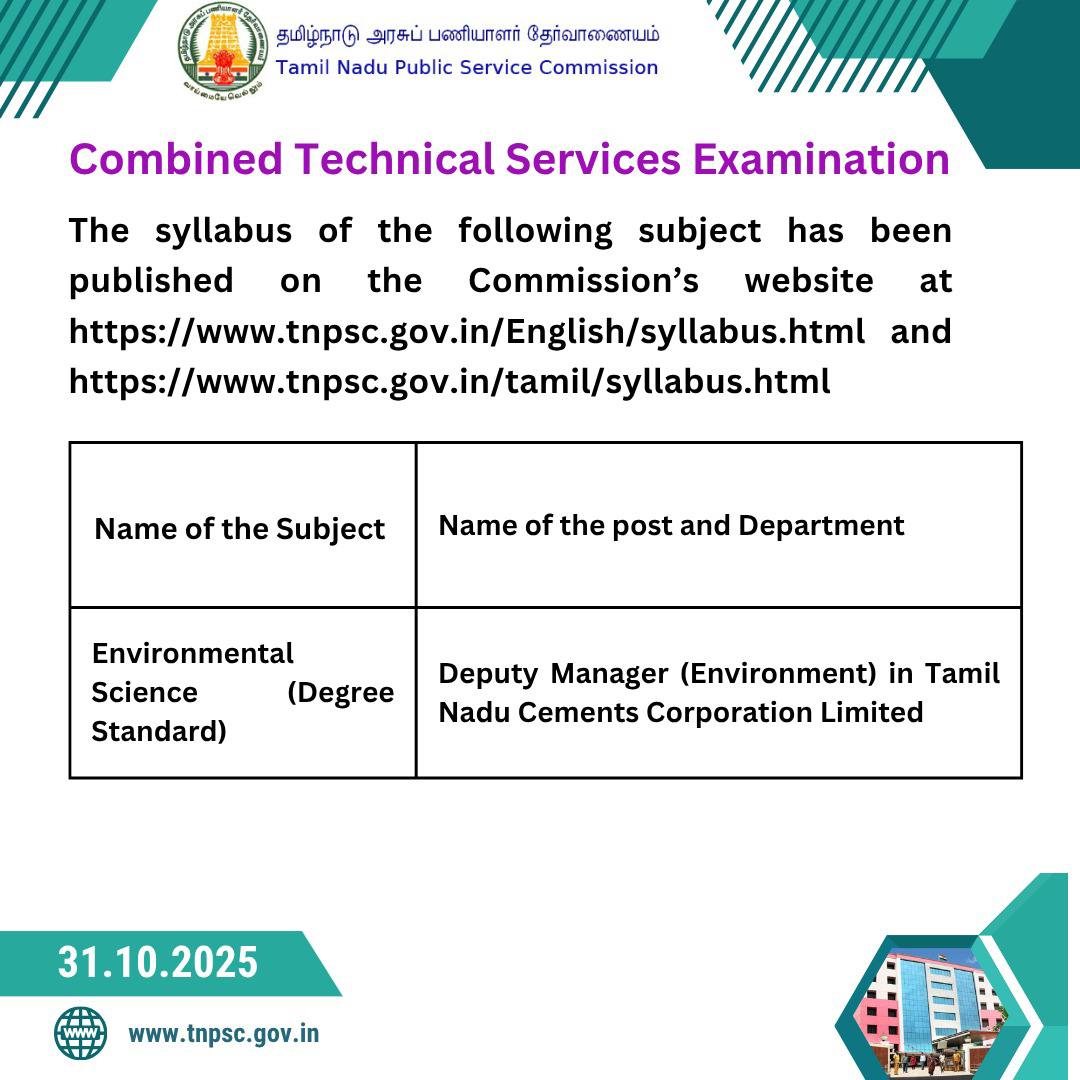 The Tamil Nadu Public Service Commission (TNPSC) has officially released the syllabus for the Combined Technical Services Examination on its website. Candidates applying for technical posts through TNPSC can now download and review the updated syllabus to enhance their preparation.
