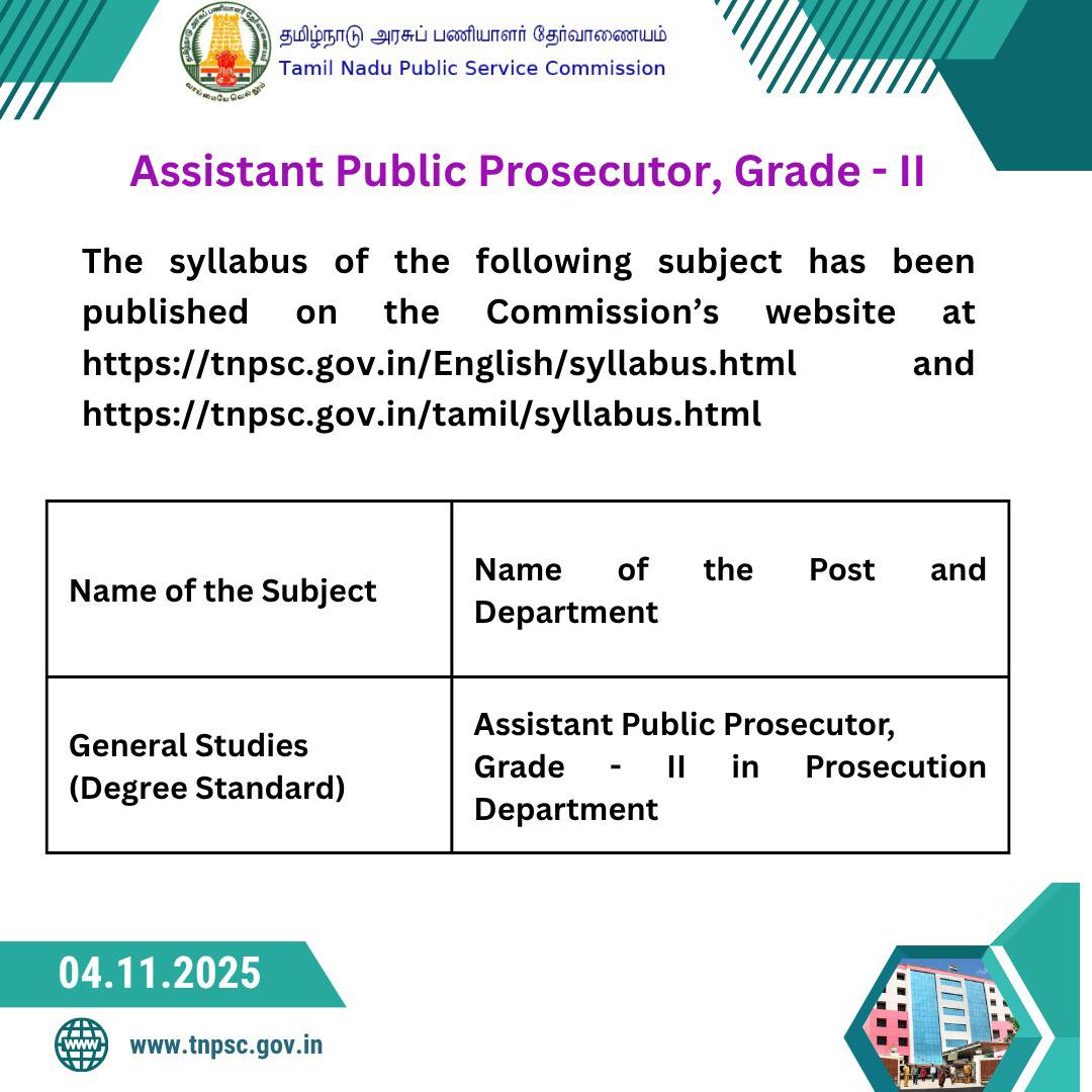 The Tamil Nadu Public Service Commission (TNPSC) has officially released the syllabus for the Assistant Public Prosecutor, GradeβII post in the Prosecution Department.