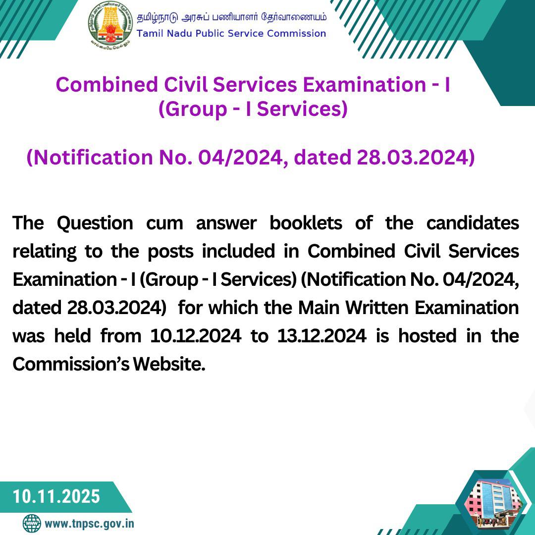 The Tamil Nadu Public Service Commission (TNPSC) has officially announced that the Question-cum-Answer Booklets for the Combined Civil Services Examination – I (Group I Services) (Notification No. 04/2024, dated 28.03.2024) are now available on the Commission’s website.