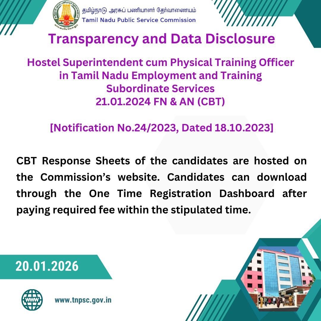 The Tamil Nadu Public Service Commission (TNPSC) has released the CBT response sheets for the post of Hostel Superintendent cum Physical Training Officer under Tamil Nadu Employment and Training Subordinate Services. The examination was conducted on 21.01.2024 (FN & AN) as per Notification No. 24/2023 dated 18.10.2023.