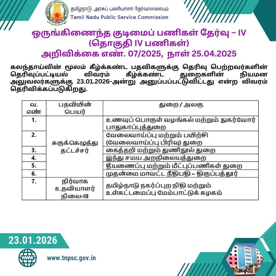 The Tamil Nadu Public Service Commission (TNPSC) has announced that the selection lists for candidates chosen through counseling for Group IV Services (Notification No. 07/2025, dated April 25, 2025) have been forwarded. On January 23, 2026, these lists were sent to the appointing officers of the following departments: