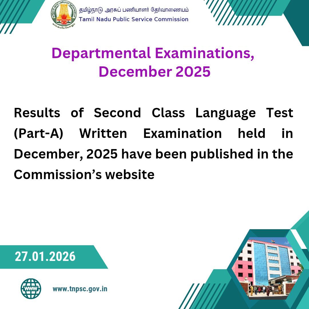 The Tamil Nadu Public Service Commission (TNPSC) has officially released the results of the Second Class Language Test (Part-A) Written Examination conducted under the Departmental Examinations, December 2025 session.