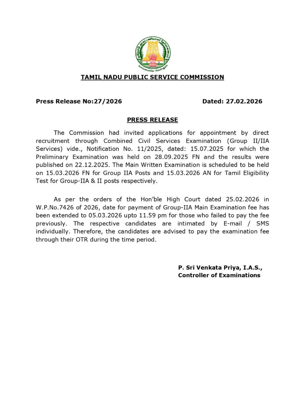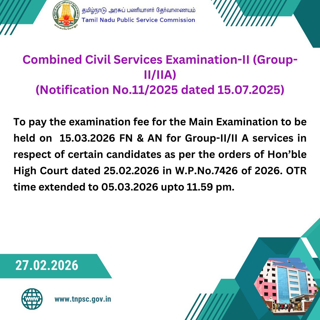 🛑 TNPSC Group II / IIA 2025–2026 – Main Exam Fee Payment Date Extended